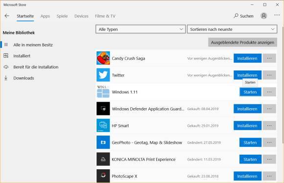 Nach dem «Kauf» (Preis: 0.00, also kostenlos) öffnen Sie die Microsoft-Store-App und gehen oben via Drei-Punkte -Icon zu Meine Bibliothek . Hier sollte Windows 1.11 nun erscheinen. Klicken Sie auf Installieren , wird die App heruntergeladen und installiert. Aufgepasst: Das Ding «wiegt» rund 280 Megabyte.